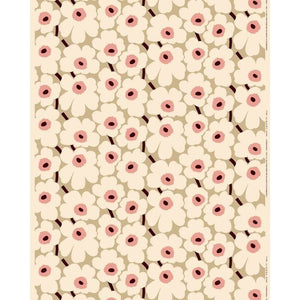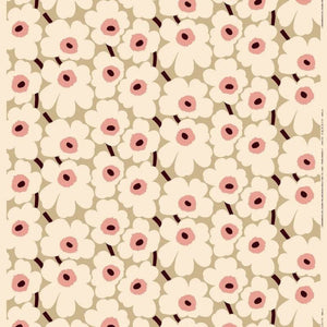 This unbleached organic cotton fabric features the Pieni Unikko pattern, which is printed in Helsinki. Unikko, symbolising creativity, was born in a time when hardly any floral designs were included in Marimekko’s collections. Maija Isola, however, was fascinated by the theme of flowers and decided to create an entire range of novel floral prints.