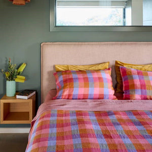 Brighten up your bedroom with the Tutti Frutti Linen Pillowcases in pink, purple, blue and orange check tartan.