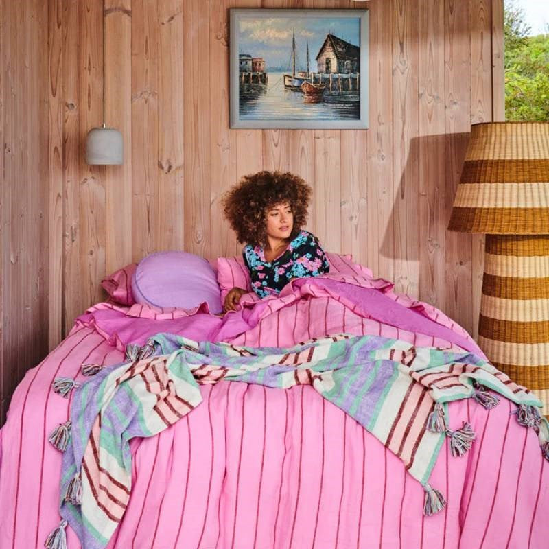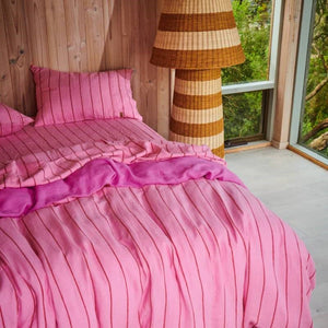 The Iced VoVo Stripe Linen Quilt Cover is as sweet as can be, with a candy marshmallow pink base and jammy red stripe.