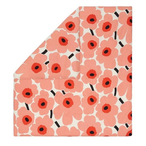 The Unikko pattern double duvet cover bottom closes with buttons. The duvet cover is made of a 94 TC cotton and linen blend. This product contains 50% organic cotton. Unikko, symbolising creativity, was born in a time when hardly any floral designs were included in Marimekko’s collections.