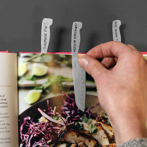 Label the handles with the name of the recipe, rate each dish out of 10 and even add personalised notes (eg, add extra garlic). Then stick the knife onto the recipe page with the handle sticking out ready for when you next need to find it. Remove and reposition the Cook Marks without leaving any damage to your cookbook.