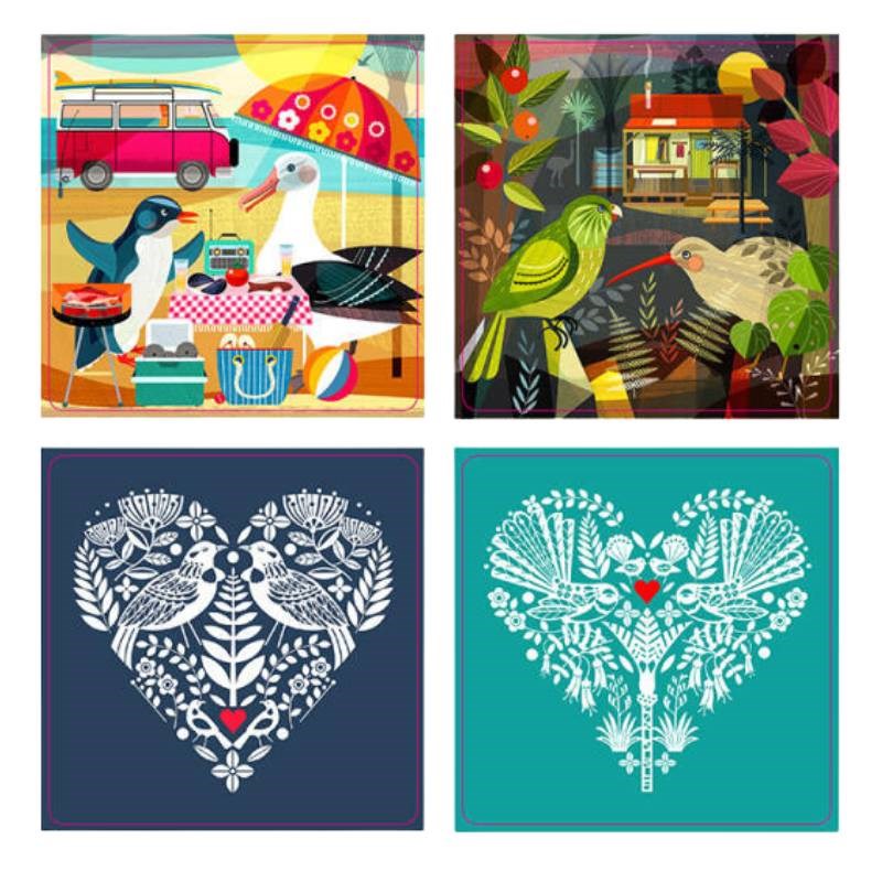 8 Stickers per pack Side 1: It Was This Big, So That's Where You are Hiding, New Zealand Turquoise Fantail Heart, New Zealand Indigo Tui Heart Side 2: Afternoon on the Farm, Kiwi Summer 3, Kiwi Summer 4, Hot Chips